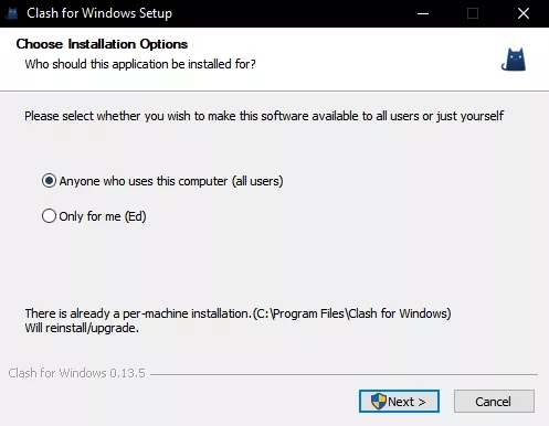 双击打开 Clash for windows.exe,同意权限,选择给所有用户安装,点击 next