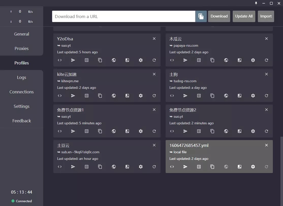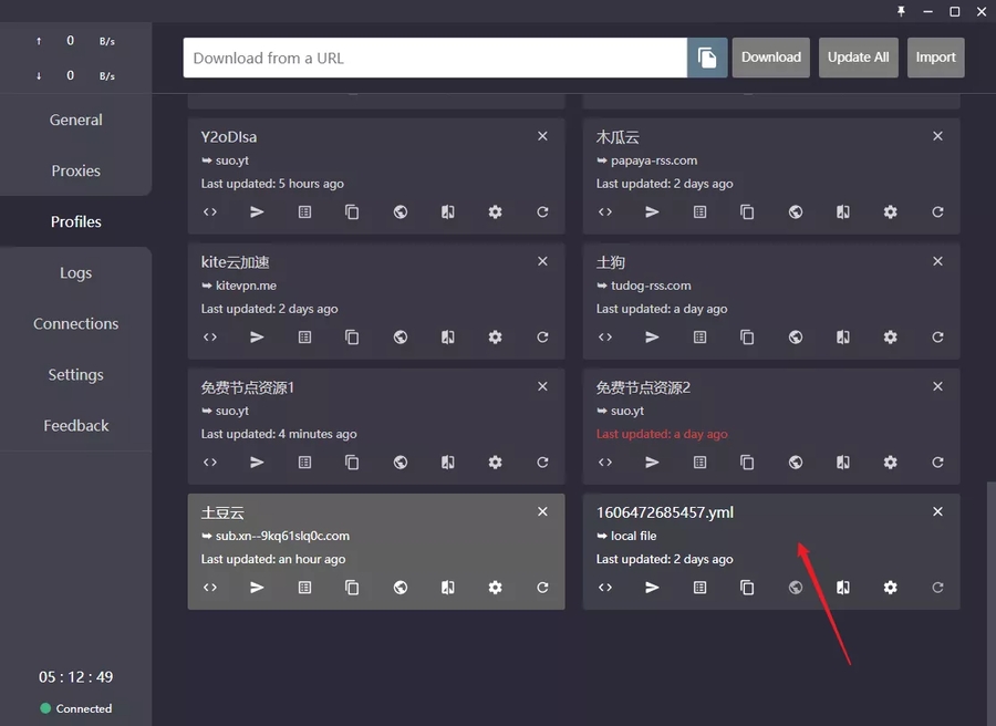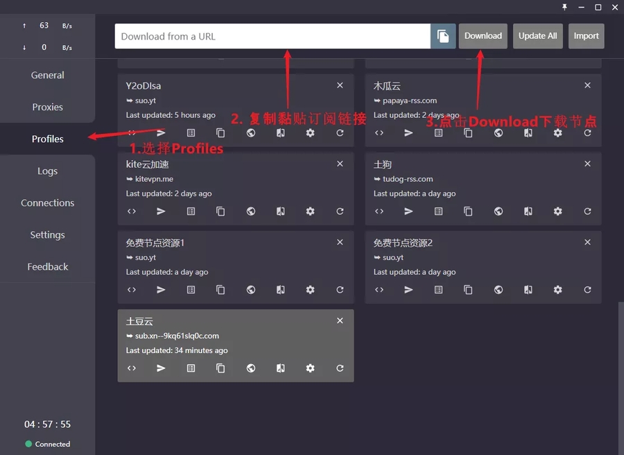 首先点击 Profiles,将订阅链接复制到图中白框内,点击 Download 下载节点组(图四)