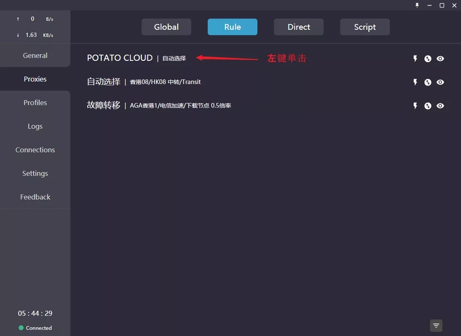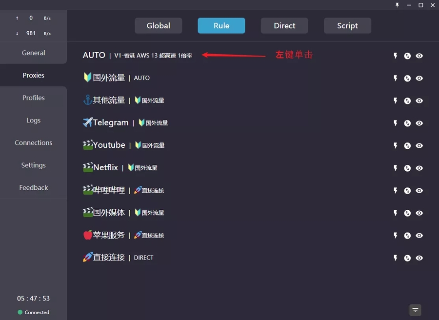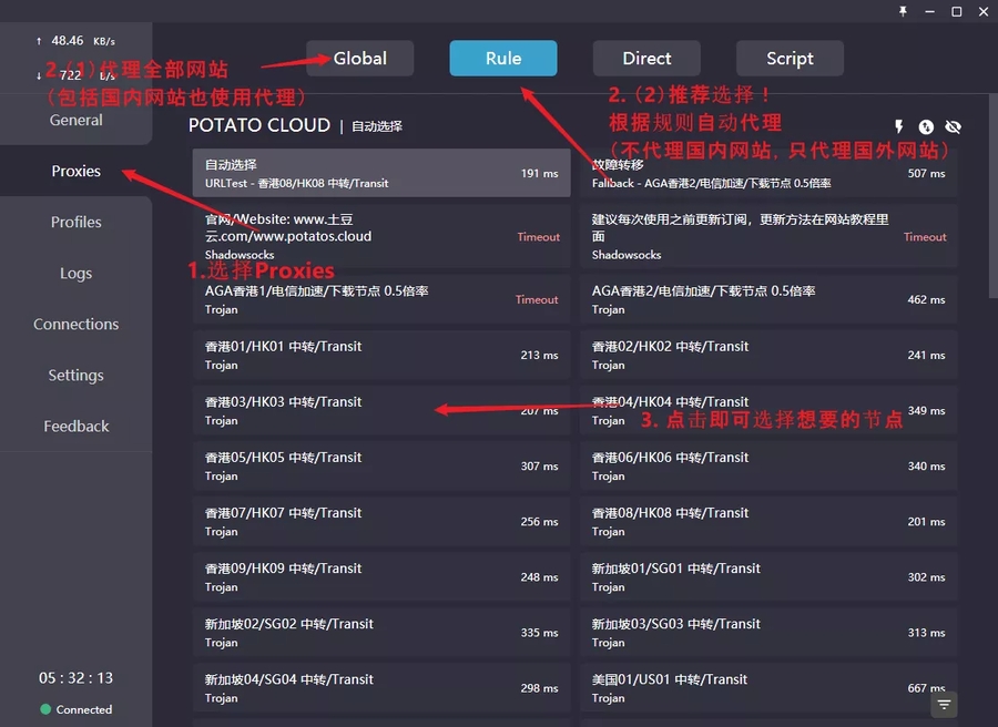 在 Proxies 中选择你想连接的节点(图九(1))。推荐选择 Rule(自动不代理国内网站,仅代理国外),如果需要全局代理全部网站时,再选择 Global,并选择你想选择的节点即可。