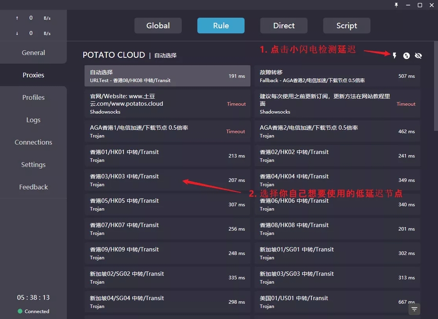 注意:如果有自动选择的话,选择自动选择即可,软件会自动选择延迟最低的节点。