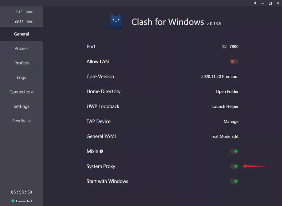 在 General 中打开 System Proxy 就可以了。如果有弹窗请求连接网络,同意即可。如果想要让此软件随系统开机自启动,打开 Start with Windows 即可。(图十一)